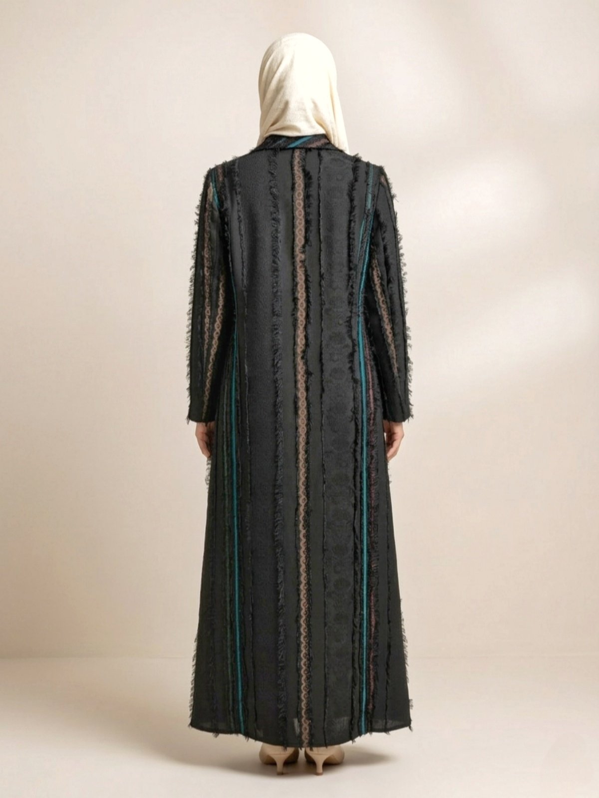 Elegant long black blazer featuring a stylish turquoise lapel collar and textured vertical fabric design. Perfect for modern modest fashion and formal wear.